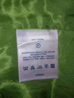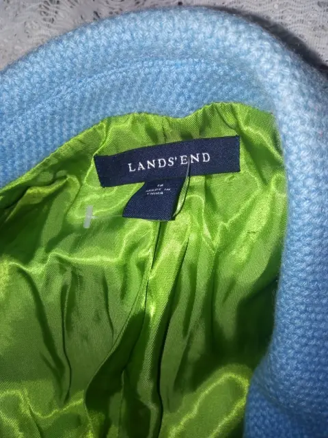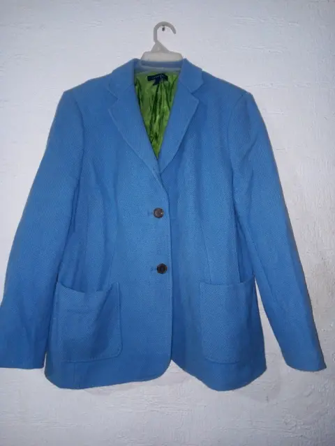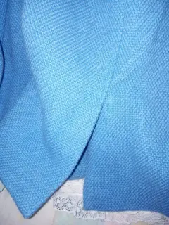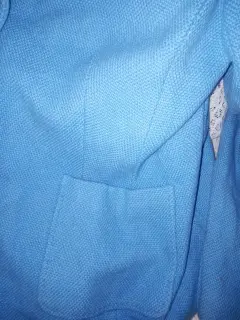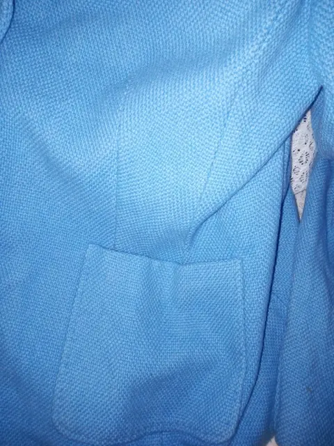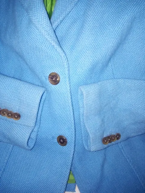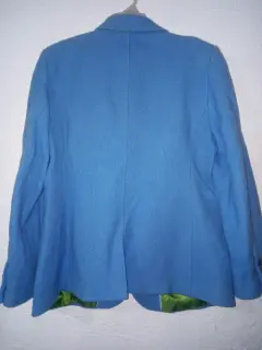 Saco en color azul claro, tiene 10 botones, 2 al frente y 4 en cada puño más pequeños. Tiene forro en color verde limón, dos bolsas al frente y abertura por detrás. Mide de axila a axila 108 cm y de largo 68 cm, más o menos.