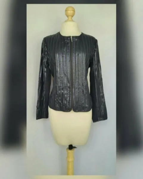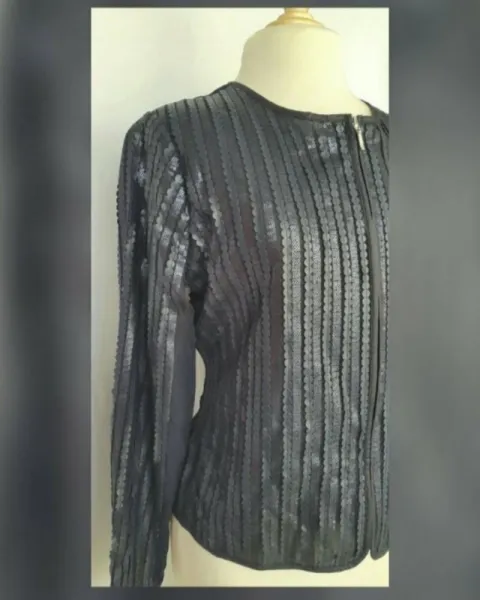 Saco c/Aplique Fake Fur y Lentejuela. Saco de vestir ligero color AZUL MARINO, c/aplique fake fur y lentejuela en zona frontal y mangas, cuello redondo, cierre p/cremallera y forro interior. Talla 32. Dimensiones cms: 41 hombro, 54 axila, 47 cintura, 52.5 zona baja, 56 largo, 59.5 largo manga. 50% poliéster, 50% poliuretano. P/lavado en casa.