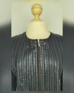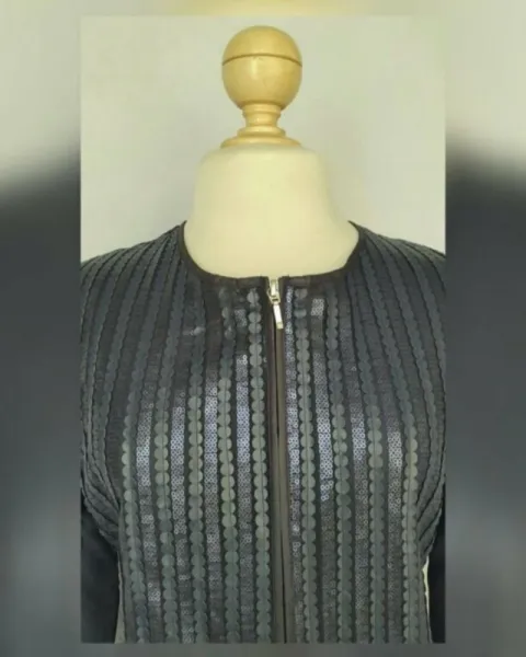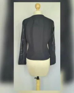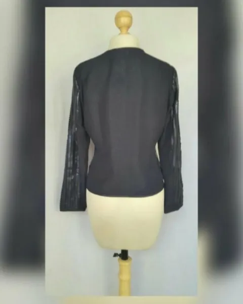 Saco de vestir ligero color AZUL MARINO, c/aplique fake fur y lentejuela en zona frontal y mangas, cuello redondo, cierre p/cremallera y forro interior. Talla 32. Dimensiones cms: 41 hombro, 54 axila, 47 cintura, 52.5 zona baja, 56 largo, 59.5 largo manga. 50% poliéster, 50% poliuretano. P/lavado en casa.