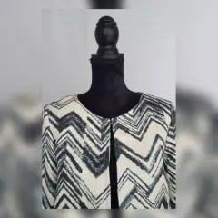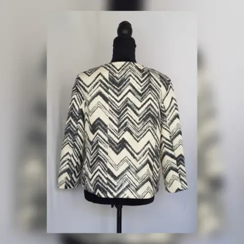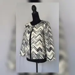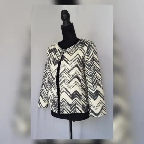 Saco clásico corte évase en tela lacrada tonos BLANCO LINO/NEGRO, cuello joya, cierre p/ganchillo, manga 3/4 y forro interior. Talla G. Dimensiones cms: 40 hombro, 50 axila, 55 zona baja, 57 largo, 51 largo manga. 70% algodón, 30% poliéster. P/lavado en casa.***NO ESTIRA, ES RÍGIDO***HECHO EN ITALIA***