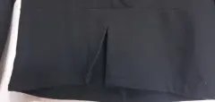 Color negro, tela tipo algodón, 1 botón al frente, cintura marcada, abertura en la espalda cubierta con aplicación de encaje, 54 cm de largo, 40 cm de hombro a hombro, 61 cm lago de manga.