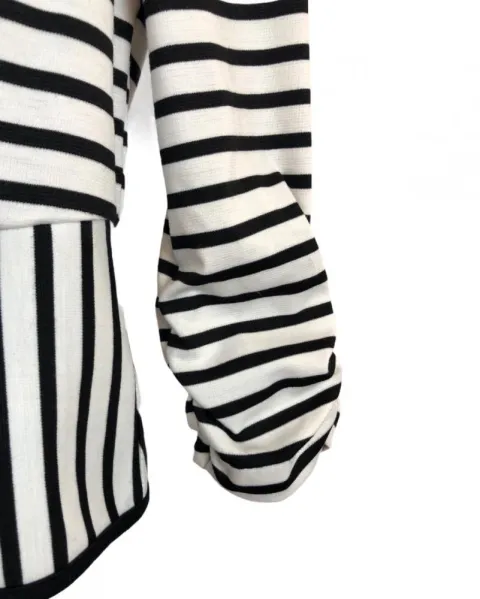 Saco corto blanco y negro. Coqueto saquito en líneas con detalle corrugado en las mangas y con ligero olán en la parte inferior, te verás súper bien con el.