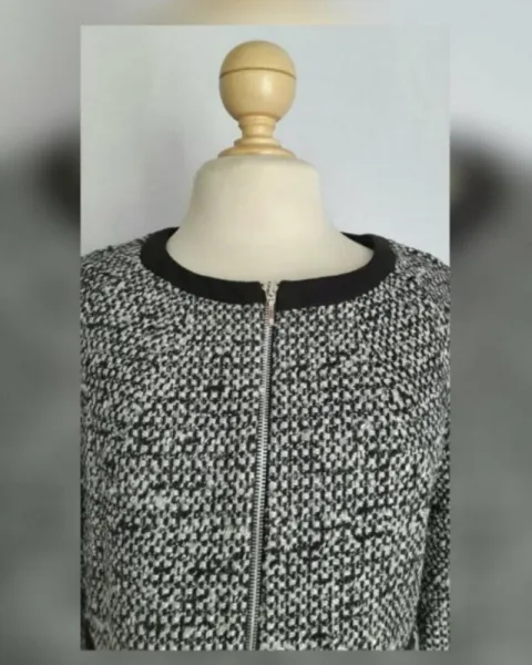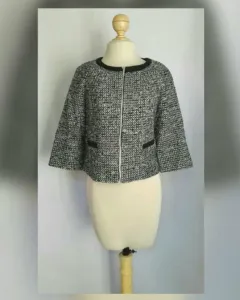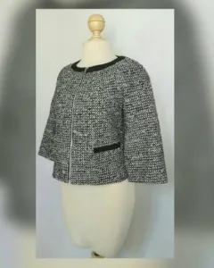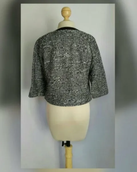 Saco cropped con acabado bucle en tonos NEGRO/BLANCO LINO e hilo metalizado, cuello redondo, cierre p/cremallera, 2 bolsillos vivo frontales simulados, manga 3/4 y forro interior. Talla 10. Dimensiones cms: 39 hombro, 52 axila, 54 zona baja, 54 largo, 42 largo. 41% acrílico, 24% poliéster, 16% lana, 13% rayón viscosa, 3% poliamida, 3% otros. P/lavado en seco.***HECHO EN ITALIA***