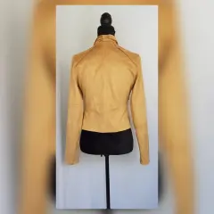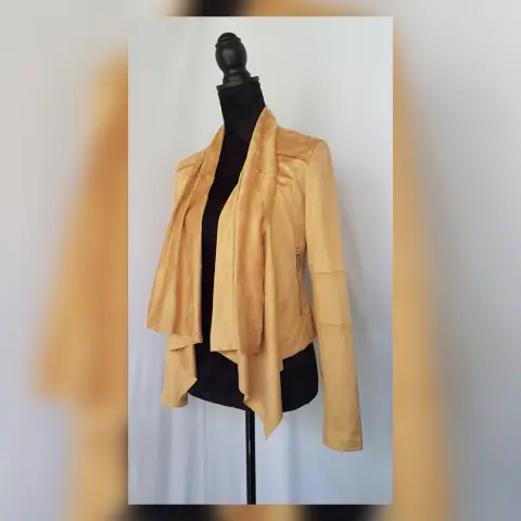 Saco cropped efecto ante color CAMEL, cuello pico efecto drapeado, sin sistema de cierre, 2 bolsos vivo laterales c/cremallera y manga larga. Talla M. Dimensiones cms: 42 hombro, 48 axila, 43 cintura, 51 zona baja, 50 largo, 63 largo manga. 100% poliéster. P/lavado en casa.***HECHO EN ITALIA***