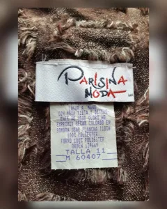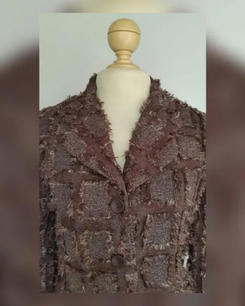 Saco cropped efecto deshilado color CHOCOLATE DEGRADADO, cuello clásico c/solapas, cierre p/botonadura y manga larga terminada en botonadura. Talla 11 (MUY REDUCIDA, da mejor a 7). Dimensiones cms: 40 hombro, 47 axila, 41 cintura, 48 zona baja, 56 largo, 58 largo manga. 100% poliéster. P/lavado en casa.***NUEVO, LE QUITE LA ETIQUETA PARA USARLO Y NO ME QUEDÓ***