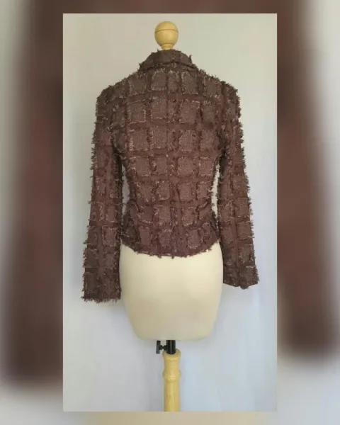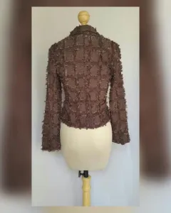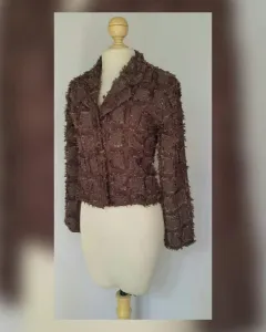 Saco Cropped efecto Deshilado. Saco cropped efecto deshilado color CHOCOLATE DEGRADADO, cuello clásico c/solapas, cierre p/botonadura y manga larga terminada en botonadura. Talla 11 (MUY REDUCIDA, da mejor a 7). Dimensiones cms: 40 hombro, 47 axila, 41 cintura, 48 zona baja, 56 largo, 58 largo manga. 100% poliéster. P/lavado en casa.***NUEVO, LE QUITE LA ETIQUETA PARA USARLO Y NO ME QUEDÓ***