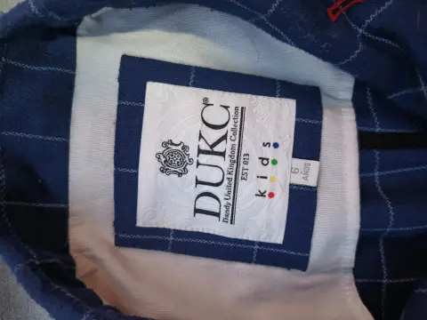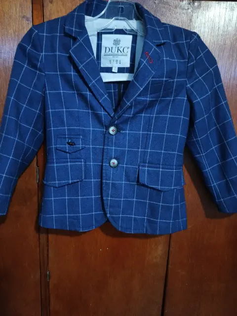 Saco de niño, talla 6, color azul rey a cuadros con líneas blancas, bolsillos delanteros solo de decoración, forro de poliéster, con una ligera y pequeña mancha en la solapa derecha
