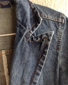 Saco de mezclilla retro. Mezclilla rígida ideal para vestidos o casual. Solapa retro, bonitas en puños y frente, bolsillos y forma acinturada