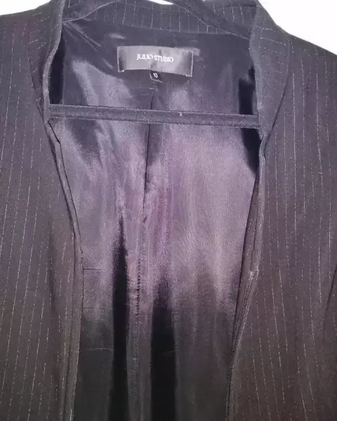 Hermoso saco negro con rallitas blancas marca Julio con cierres en las mangas y con hombreras medidasde hombre 42 cm de largo 53 cm y nada mas de detalle el cierre de en medio no tienen la patita muestro en foto con forro bolsas con cierre oculto