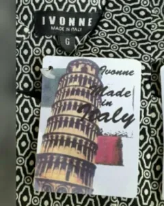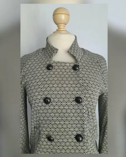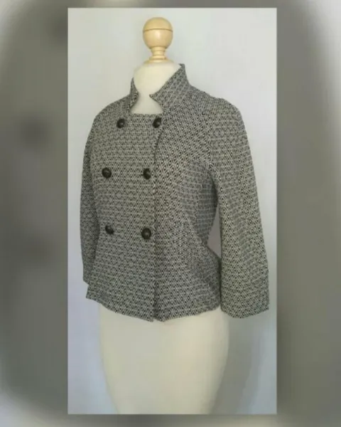 Saco estilo Spencer c/estampado en base color NEGRO y figuras geométricas tono BLANCO LINO, cuello Perkins, cierre p/botonadura doble, 2 bolsillos frontales vivo simulados y manga 3/4. Talla G. Dimensiones cms: 36 hombro, 49 axila, 53 zona baja, 53 largo, 48 largo manga. 43% poliéster, 43% viscosa, 11% poliamida, 3% elastano. P/lavado en casa.***HECHO EN ITALIA***