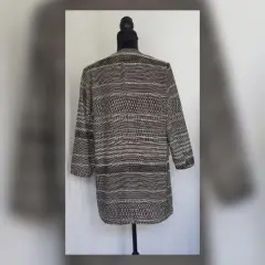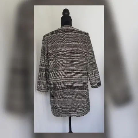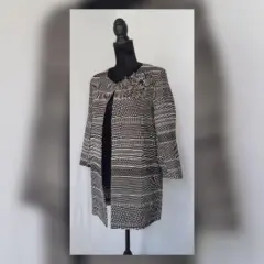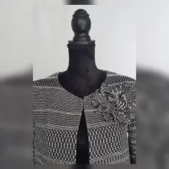 Saco Largo aplique Flor. Saco largo corte évase bitono BLANCO LINO/NEGRO, cuello redondo, aplique flor mismo tejido, cierre p/ganchillo, 2 bolsos simulados c/tapeta y manga 3/4. Talla G. Dimensiones cms: 42 hombro, 54 axila, 56 zona baja, 81 largo, 51 largo manga. 70% algodón, 20% poliéster, 6% acrílico, 4% elastano. P/lavado en casa.***NO ESTIRA, ES RÍGIDO***HECHO EN ITALIA***