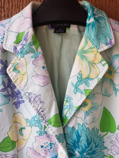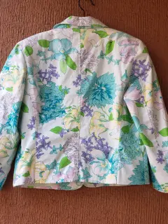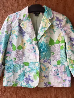 Saco ligero Rafaella. Bello saquito en tela de mezclilla ligera con estampado floral colores firmes,con bolsitas y botones frontales, manga larga pero puede hacerse 3/4*Talla 10 pero puede quedar a 8 también, estira poco*Medidas: Axilas 49cm. Hombros 41cm. Largo 54cm*Sin detalles**Calificación: 10**NO OFERTAR NI BLOQUEAR PRENDASI NO PIENSAS COMPRAR**GRACIAS POR TU PREFERENCIA*