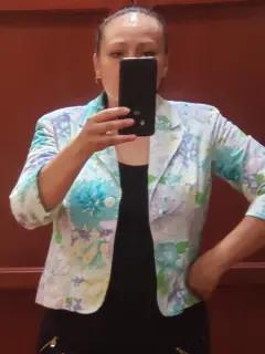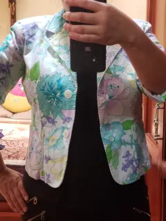 Bello saquito en tela de mezclilla ligera con estampado floral colores firmes,con bolsitas y botones frontales, manga larga pero puede hacerse 3/4*Talla 10 pero puede quedar a 8 también, estira poco*Medidas: Axilas 49cm. Hombros 41cm. Largo 54cm*Sin detalles**Calificación: 10**NO OFERTAR NI BLOQUEAR PRENDASI NO PIENSAS COMPRAR**GRACIAS POR TU PREFERENCIA*