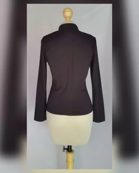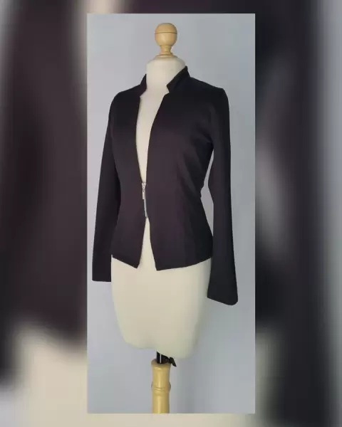 Saco ligero color NEGRO ÉBANO, cuello pico c/solapa invertida, cierre p/cremallera tono PLATA BRILLANTE y manga larga. Talla M. 36 hombro, 47 axila, 42 cintura, 51 zona baja, 60 largo, 62 largo. 96 poliéster, 4% elastano. Para lavado en casa.