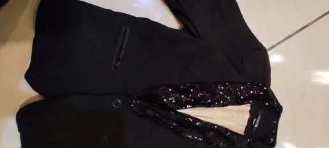 Hermosísimo saco negro intenso con solapa de lentejuelas , talla L es corto excelente para look juvenil casual o formal elegantioso