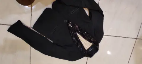 Saco negro con lentejuela. Hermosísimo saco negro intenso con solapa de lentejuelas , talla L es corto excelente para look juvenil casual o formal elegantioso