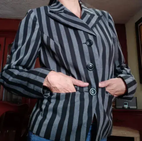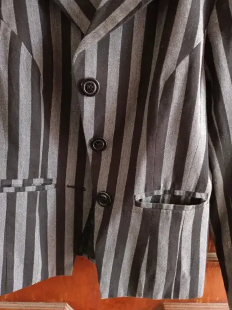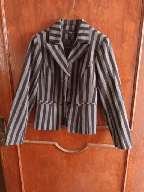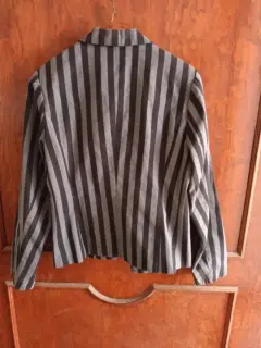 Saco corto rayas gris con negro, forrado negro en buenas condiciones, es corto da enmedio cadera es talla L pero la cintura viene reducida como para talla s, muy vestidor para vestido o pantalón.