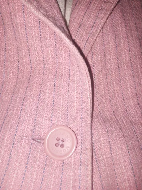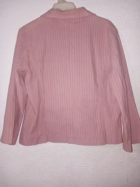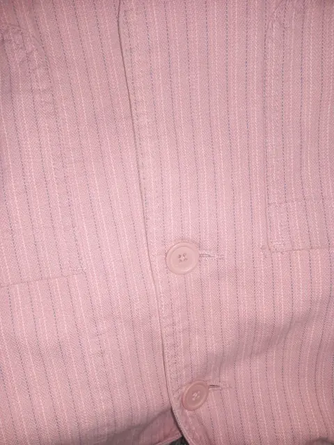 Saco rosa y rayas. Saco rosa y rayas azules, grises y blancas. Tiene tres bolsas al frente y dos botones para cerrar la pieza. Requiere tintorería. Medida de axila a axila 110 cm y de largo 58 cm