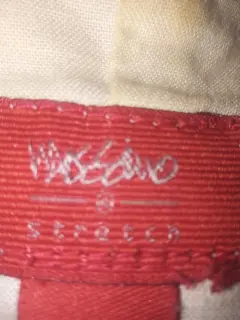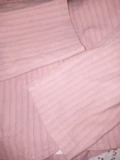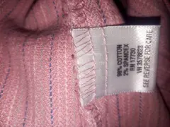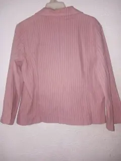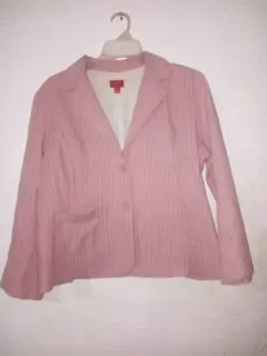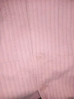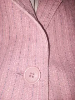 Saco rosa y rayas azules, grises y blancas. Tiene tres bolsas al frente y dos botones para cerrar la pieza. Requiere tintorería. Medida de axila a axila 110 cm y de largo 58 cm