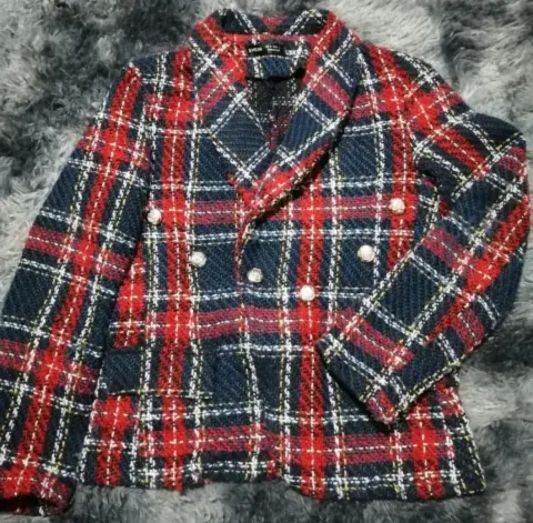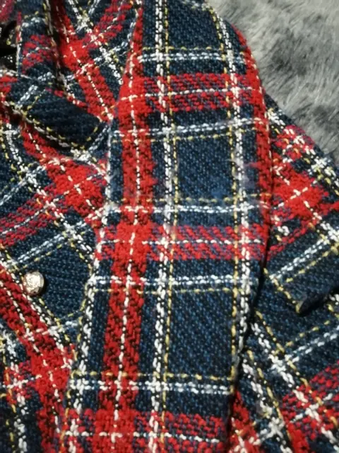 Hermoso saco en color rojo convinado con azul a cuadros, no tiene forro por dentro talla XS, botones en color dorado que resaltan los coloresDetalle en los codos, la tela esta un poco desgastada
