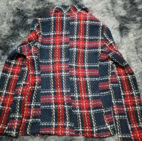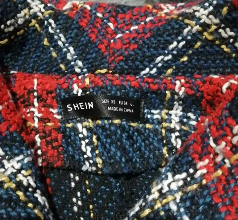 Saco tipo abrigo shein. Hermoso saco en color rojo convinado con azul a cuadros, no tiene forro por dentro talla XS, botones en color dorado que resaltan los coloresDetalle en los codos, la tela esta un poco desgastada
