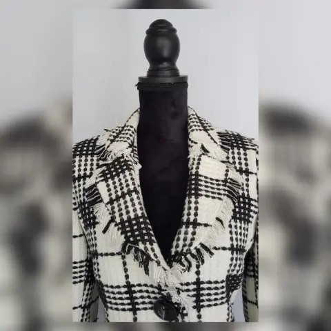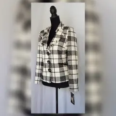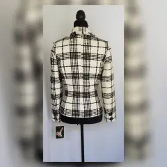 Saco tradicional tartán bitono MARFIL/NEGRO, cuello clásico c/solapas muesca efecto deshilado, cierre p/botonadura, 2 bolsos vivo simulados, manga larga terminada en botón y forro interior. Talla 32. Dimensiones cms: 40 hombro, 52 axila, 44 cintura, 53 zona baja, 62 largo, 60 largo manga. 100% poliéster. P/lavado en seco.
