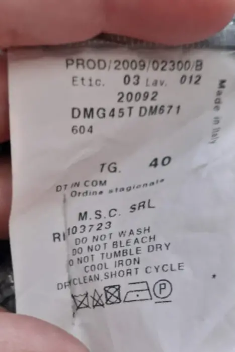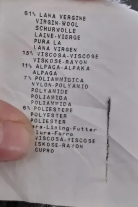 Talla 4= SBusto: 83.82 cmCintura: 62.23 cmCadera: 88.9 cmHecho en Italia- 61% lana virgen,15% viscosa, 11% alpaca, 7% poliamida y 6% poliésterEl único detalle que tiene es que la etiqueta de los materiales, está rasgada, pero la prenda no tiene detalles.