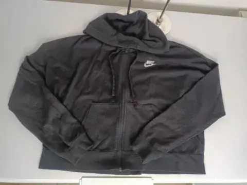 ✨Suéter corto de algodón cómodo y suave, talla M, marca Nike, color negro intenso con agujetas incluidas para ajuste de gorro.