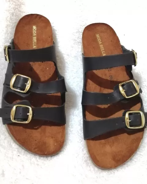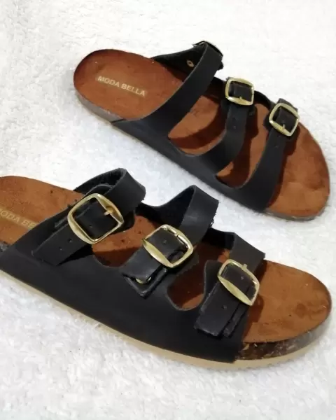 3 sandalias 3ebillas negro. Huarache negro, tipo sandalia de meter el pie, diseño tres ebillas doradas, ligero y cómodo. Mexicano Número #23cm. Lo que necesites: Pregúntame o visita mi closet para más modelos y númeración. Aplica mi código y tu primer compra en la App tiene descuento.