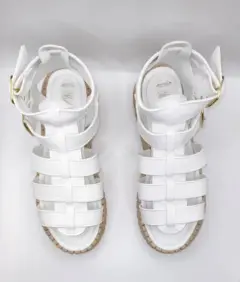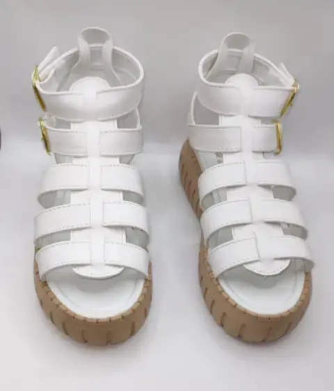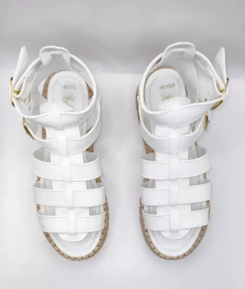 Padrísimas sandalias color blanco, vinipiel diseño de gladiador romano doble correa con ebillas ajustables, suela plataforma 5cm es ligera muy cómoda. Mexicano Número #24 cm. Si es tu primer compra en la App busca Código Promocional de descuento -$100 en tu primera compra: lucyrmxXqQJ9
