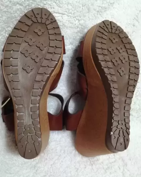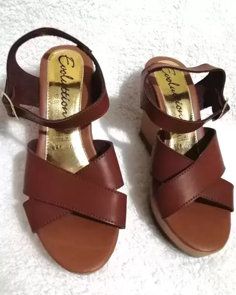Huarache color café estilo tiras cruzadas diseño plataforma de cuña, de correa fácil ajustable, suela antiderrape no pesa muy ligero y cómodo. Medida plataforma al frente 3cm a tacón de 11.5cm . Mexicano acomoda #24cm. Visita mi espacio para más modelos y númeración. Usa mi código de descuento para tu primer compra dentro de la App.