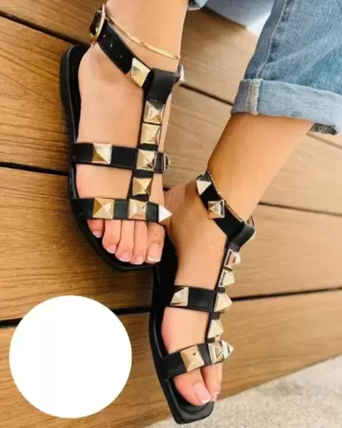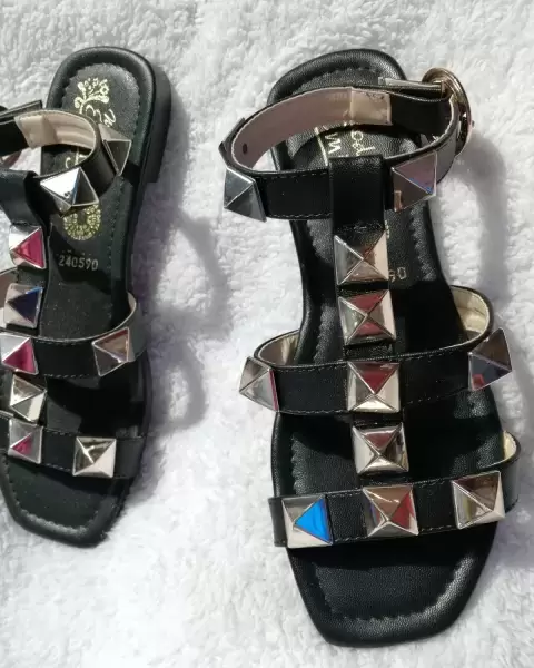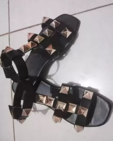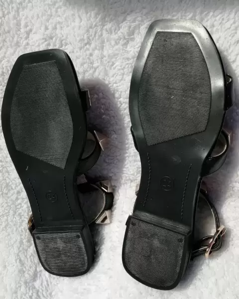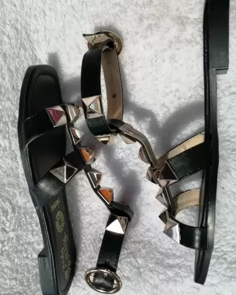 Hermosa sandalias color negro, diseño de correa con ebilla y estoperoles, suela bajita. Mexicano Número #24cm. Visita mi clóset para más modelos y numeración. Aplica mi código y tu primer compra en la App tiene descuento.