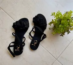 Hermosas sandalias de gamuza. Cómodas sandalias color negra con diseño de pétalos al frente, plantilla y diseño de gamuza sintética, suela antiderrapante, sin detalles y nuevas