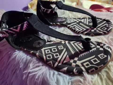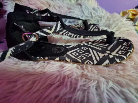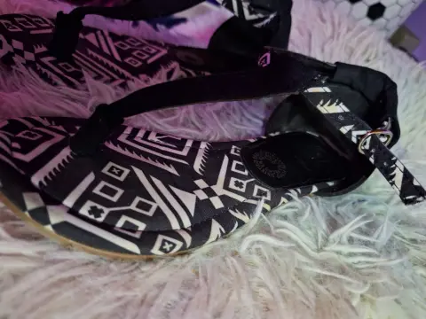 Bonitas sandalias de color negro con blanco, son de tela como tipo lona. No tienen tacón, son de piso y se abrochan