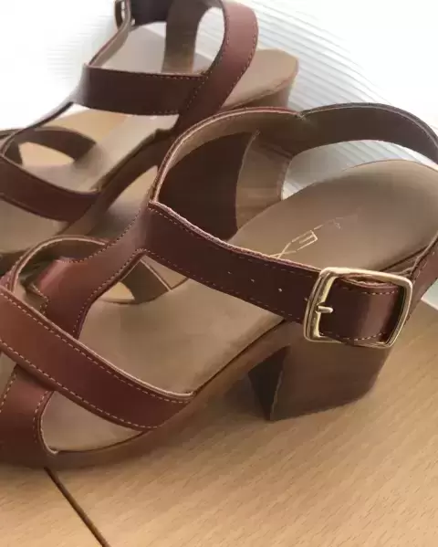 Sandalia Alexa 4.5 café. Sandalias de tacón de 10cm , una sola puesta marca Alexa ligeras, para usar con jeans, falda, ropa casualColor miel súper combinables