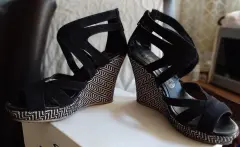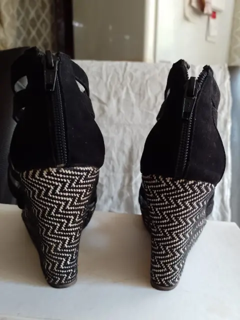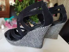 Es una sandalia color negro tipo gamuza. La plataforma mide 10cm de alto y de enfrente 2cm de alto. La plataforma es como tejida blanca con negro. Tienen cierre en la parte de atras.