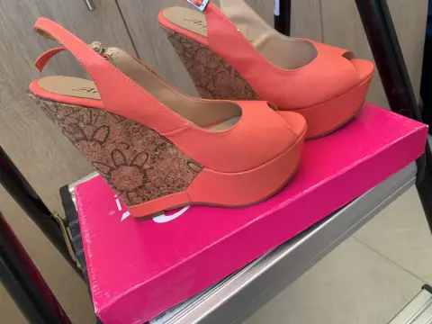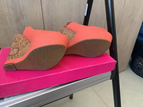 Sandalia color coral con diseño en tacón tipo corcho con flores corte sintético, talla 22.5 una sola puesta