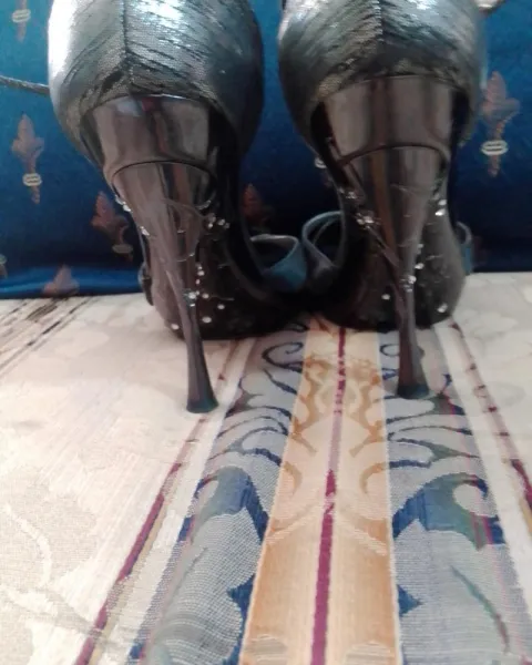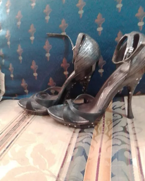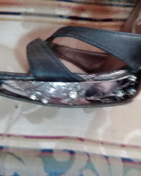 Sandalias de tacon de aguja marca Dione, tiene hermoso grabado y piedreria en la parte de abajo y tacón. Esta marcado como negro pero es color plomo oscuro. Están hermosos y en muy buen estado!!