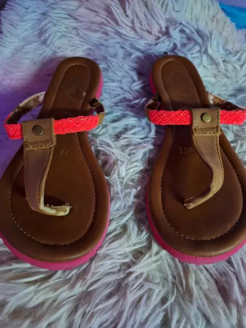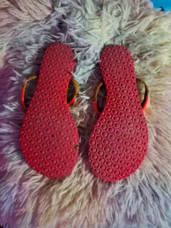 Frescas sandalias de color café con rosa. Son de piso y lo rosa es como tejido. Como las tenía guardadas se está como descarapelando lo café de adentro de las cintas y de donde se mete el dedo (se alcanza apreciar en la foto) pero ni afecta su uso y no se ve puestos