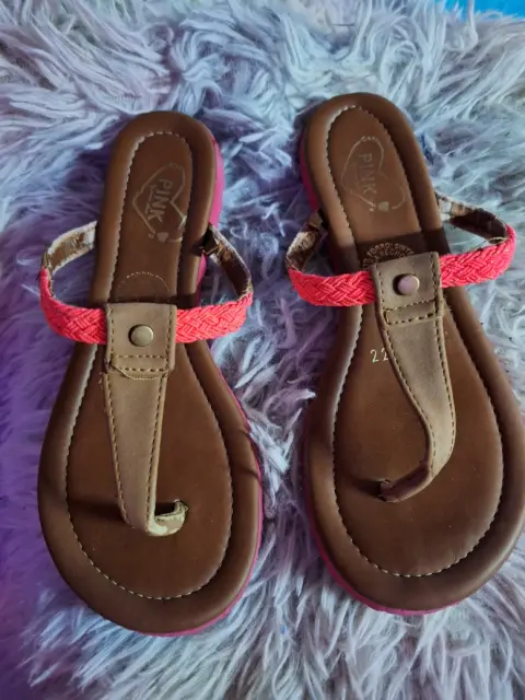 Sandalias cafe con rosa. Frescas sandalias de color café con rosa. Son de piso y lo rosa es como tejido. Como las tenía guardadas se está como descarapelando lo café de adentro de las cintas y de donde se mete el dedo (se alcanza apreciar en la foto) pero ni afecta su uso y no se ve puestos
