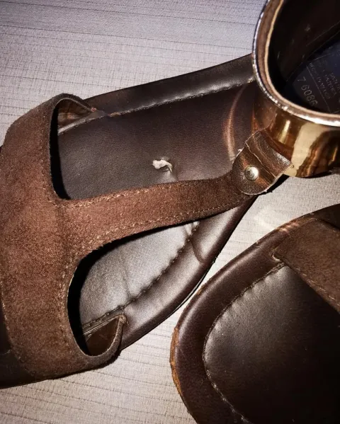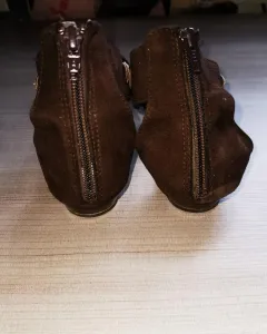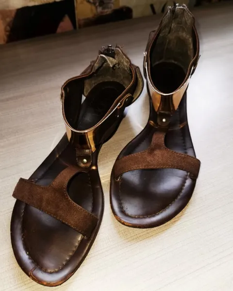 Hermosas sandalias cafés con adorno dorado en el área del empeine. Uno de ellos tiene agujerito en la suela como se muestra en la fotos aunque no afecta en nada, fuera de eso en excelente estado.Se ven preciosos!!TALLA 26MX