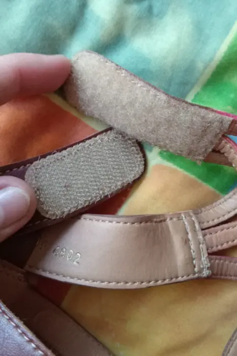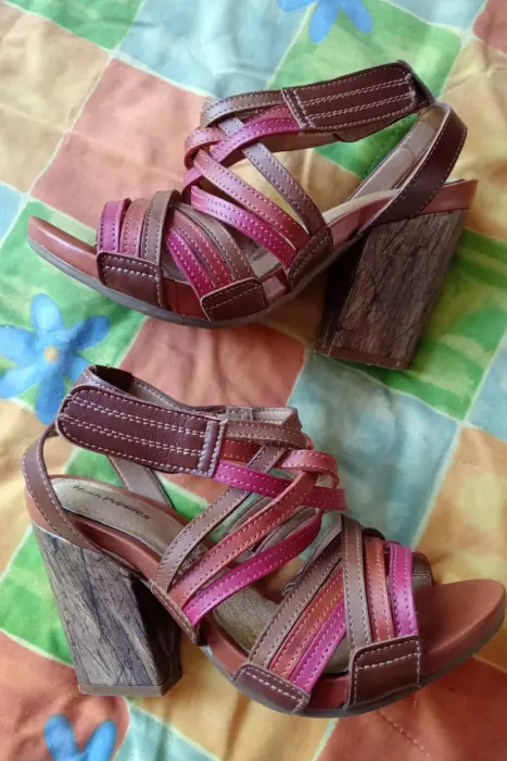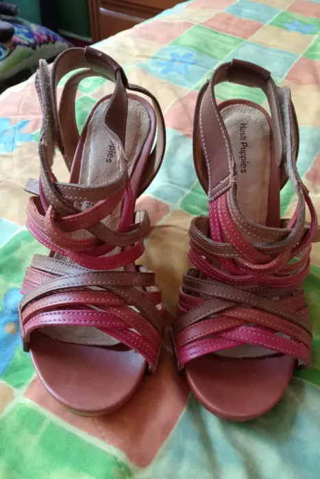 Sandalias de piel. Sandalias de tiras en tonos rojos con broche de velcro y de pielNúmero 2.5Hush PuppiesTacón ancho, altura: 9cmEn perfecto estado