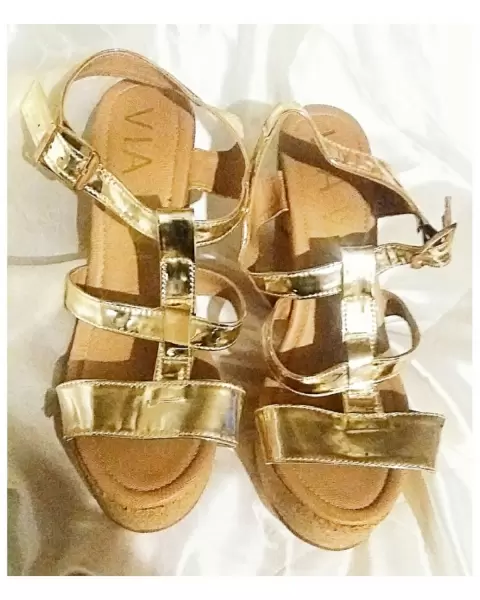 Hermosas sandalias tipo charol dorado con plataforma y tacón de 13 cm, usados una vez sin detalles. Para usarlas en esas ocasiones especiales y lucir como una modelo despampanante!
