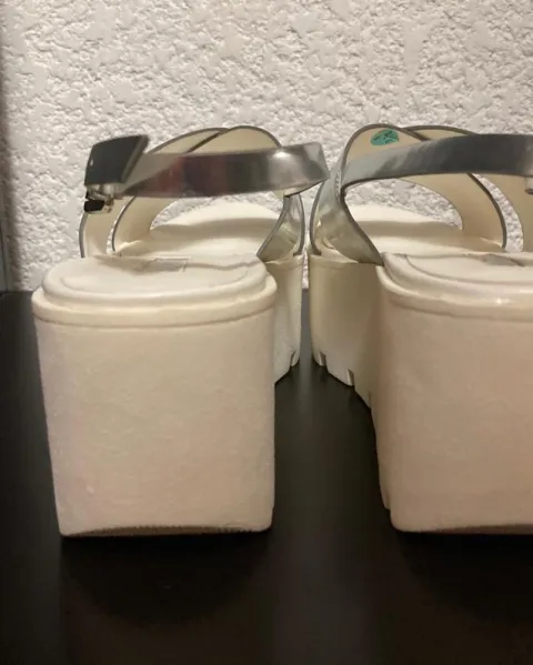 Hermosas sandalias de plataforma únicas en estilo, plataforma de 5 cm., ideales para looks casuales, acabado en color plata, totalmente nuevas sin ninguna puesta.