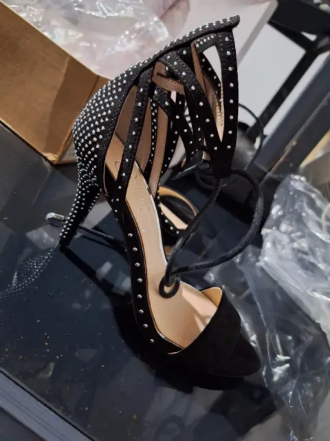 Sandalias de Tacón Jessica Simpson 2.5mx. Zapatillas de tacón abiertas, color negro con estopel plateado, totalmente nuevas, Talla 2.5 mx.