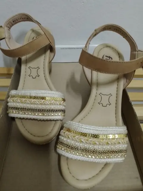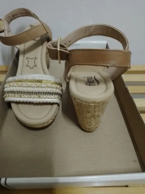 Sandalias Flexi. Lindas Sandalias Flexi, número 22.5, con una plataforma aprox 6 cm, una sola puesta, sin detalles, blancas con decoración dorada para armar un lindo outfit