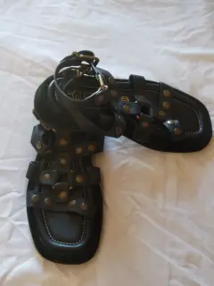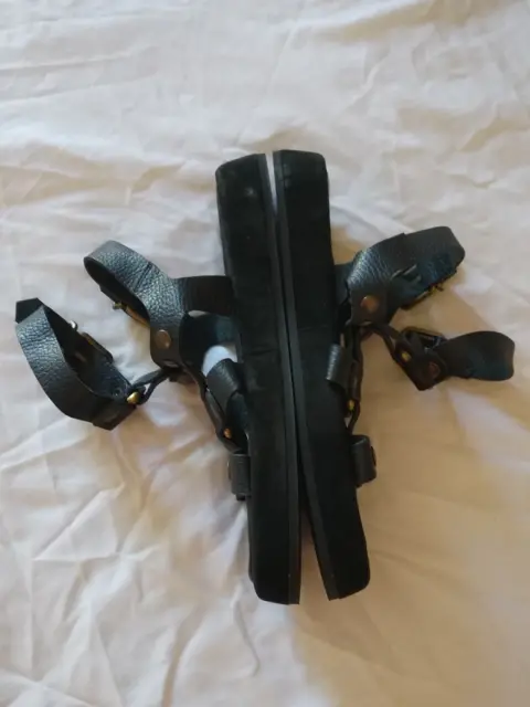Bonitas sandalias tipo gladiador color negro con estoperoles dorados, tienen plataforma para mayor comodidad. Talla 25 cm. En buenas condiciones aún se utilizaron poco.