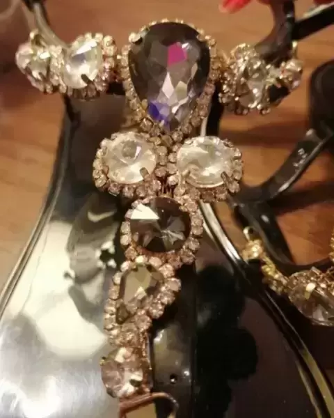 Sandalias increíblemente brillantes. Marca LilianaTalla: 36Color: negro brillantePiedrería central en diferentes tonos ,sin ningún detalle,toda la piedrería está completa en buen estadoHerrajes en buen estadoMaterial de la sandalia: PlásticoNo tiene caja originalSe entrega sanitizado