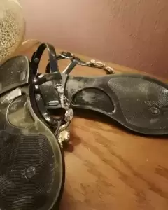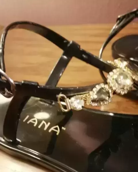 Marca LilianaTalla: 36Color: negro brillantePiedrería central en diferentes tonos ,sin ningún detalle,toda la piedrería está completa en buen estadoHerrajes en buen estadoMaterial de la sandalia: PlásticoNo tiene caja originalSe entrega sanitizado