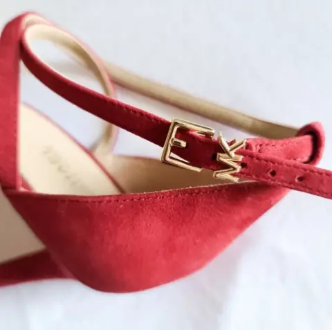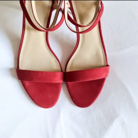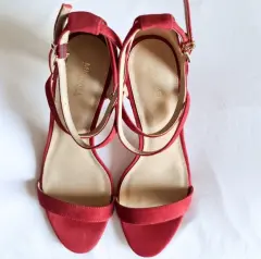 Hermosas sandalias color scartlet efecto ante, tacón de 8 cm. De aguja. Con cinta cruzada en el tobillo.Incluye caja. Etiqueta en la suela